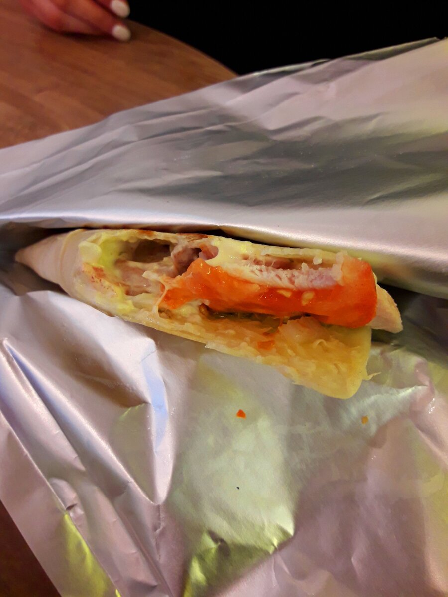 Кыстыбургер дочь заказала с копченой курицей и соусом «Цезарь». И вот она открывает свою заветную упаковочку. А там тонкий лаваш и в него завернуто филе курицы, томаты и зелень салата. Все пропитано соусом.