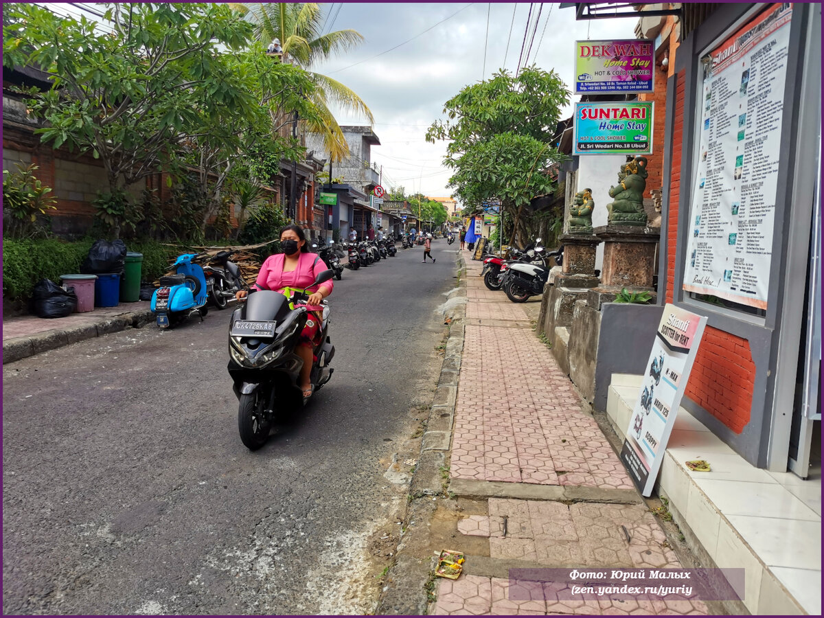 Из статей и видео про Убуд я получил тонну информации об особой духовности и культурности этого региона. Настолько его воспевают, что я серьезно ожидал стать если не инструктором по йоге, то как минимум культуроведом. Просто из-за того, что поселюсь здесь на пару дней. А в итоге меня встретил переполненный транспортом провинциальный город с отвратительно узкими тротуарами и большим количеством таксистов, настойчиво предлагающих свои услуги.