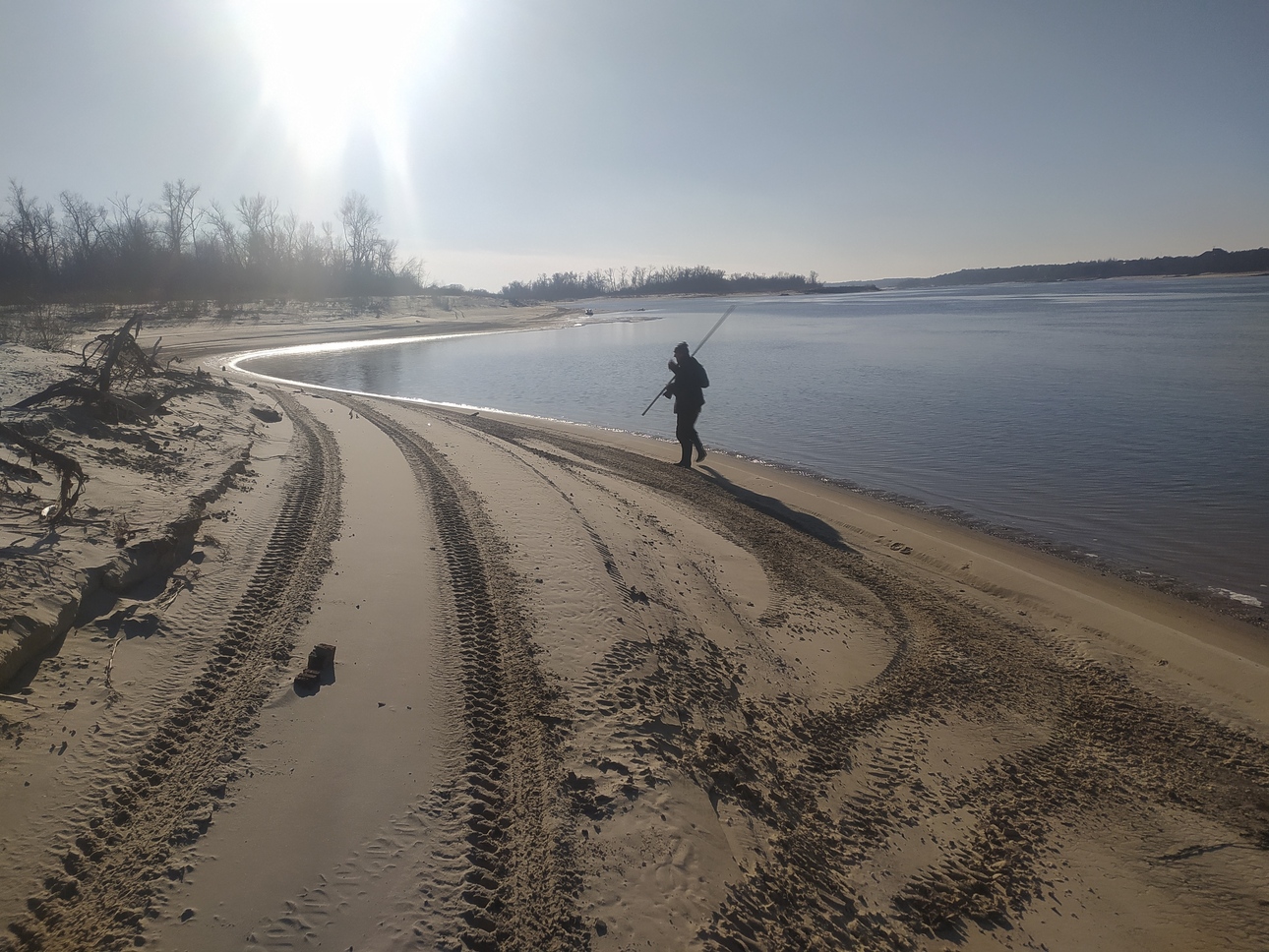 Поймы были темными и пустынными среди кустарников. Клочья тумана свисали с темных, искривленных ветвей, словно замерзшие обломки паруса в огромном, спокойном море. Колоннада безлистных тополей поддерживает небо.