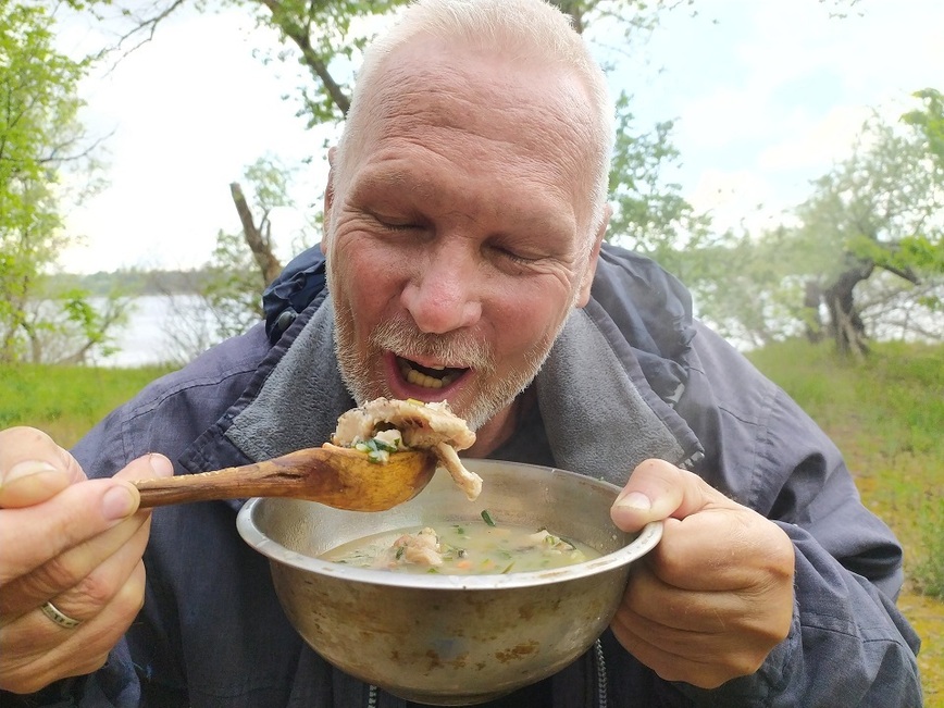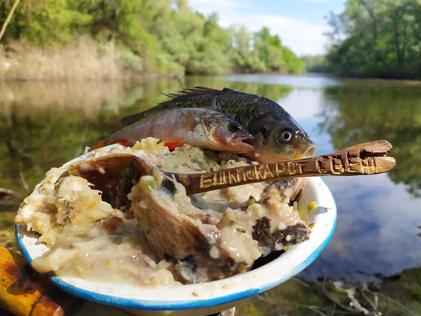 Однако сначала я проварил в котелке рыбьи головы и хвосты. В конце же приготовления варева торжественно опустил в него куски рыбьих тушек. Это и стало главным аргументом того, чтоб все-таки назвать блюдо «ухой». Впрочем, после окончания сытной трапезы и машинального творческого переосмысления этого рыбного (все-таки рыбного!) кулинарного творения придумалось такое его наименование как рыбная «гаряча мешанка» (после посещения славянских европейских стран произошло смешение их похожих лексем).
