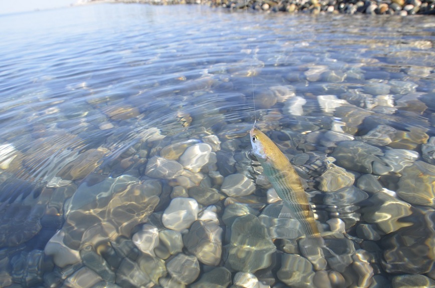 Я ловил 5-м классом, используя плавающий шнур с утяжеленной и короткой головкой (Shooting Head), быстро-тонущий лидер длиной 1.5 метра. Поводок 0.16 мм из флуорокарбона я сделал длиной 2 метра. Моя мушка, связанная на серебристом крючке с длинным цевьем № 6 имитировала маленькую рыбку. Мы приехали на рыбалку перед закатом, волнение моря было около одного балла, но море при этом было абсолютно чистое.