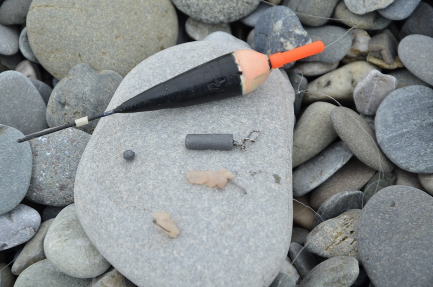 Поплавочная снасть состоит из удилища 7 – 8 метров, основной лески 0.2 – 0.22 мм, поплавка под грузило 2 – 3 грамма, самого грузила соответствующего размера, скользящего по леске. Для соединения основной лески с поводком используются микрокарабины 1.5 – 3 мм.
